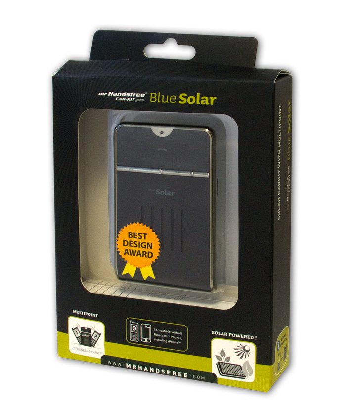 Bluetooth hands-free sada Mr.Handsfree Blue Solar je určená pre bezpečné a komfortné telefonovanie počas šoférovania. Umiestňuje sa na čelné sklo vozidla. Zariadenie obsahuje vstavaný solárny panel, ktorý slúži na priebežné dobíjanie batérie. K zariadeniu je možné pripojiť a používať 2 telefóny v rovnakom čase (Multipoint). Pohotovostný režim je 900 hodín, dĺžka hovoru až 6 hodín.